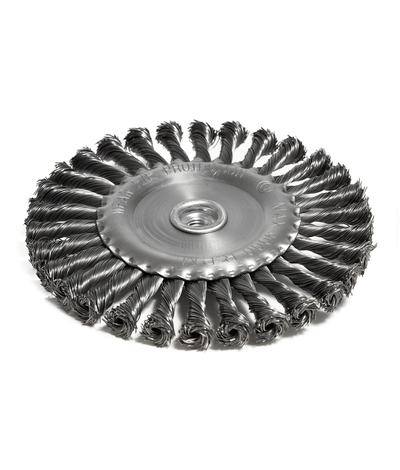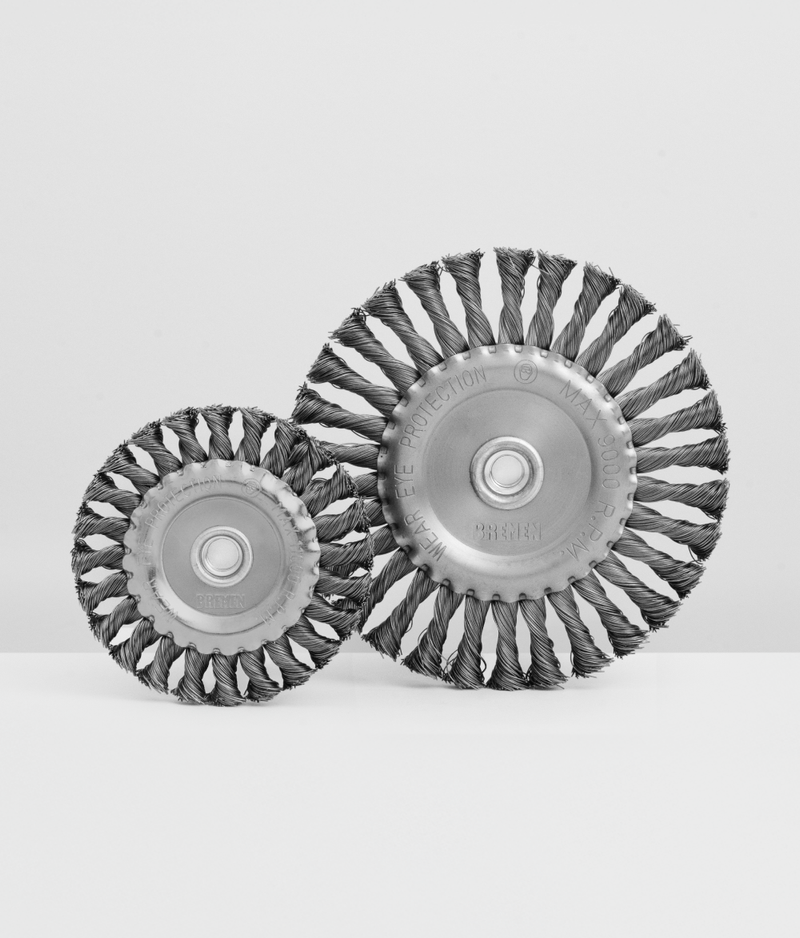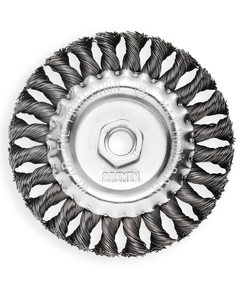 | Rosca M14 para amoladora angular. | Desbaste agresivo a alta velocidad. | Trenzas de alambres de acero de Ø0.5 mm de díametro. | Cód. 8423: 24 Nudos trenzados de acero. | Cód. 8495: 30 Nudos trenzados de acero.