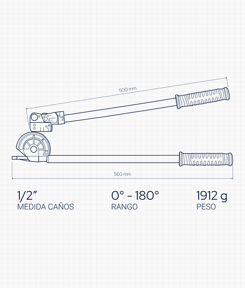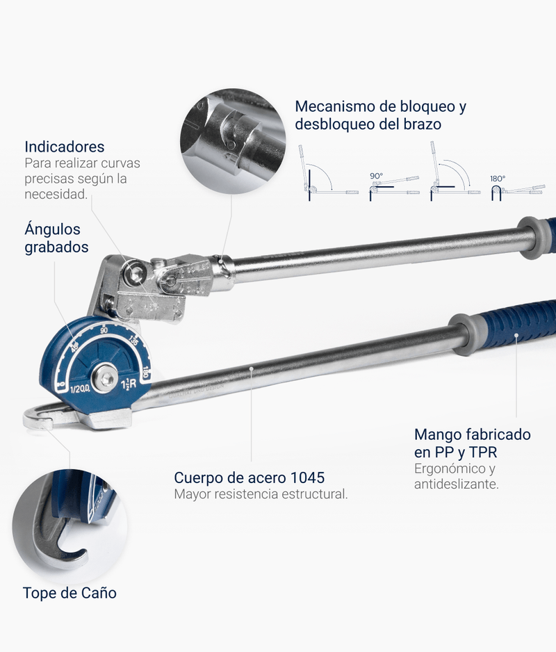 | Mecanismo a palanca. | Rango de doblado de 0° a 180°. | Traba de fijación entre ángulos 0° a 90° y 90° a 180°. | Apta para caños de cobre, aluminio, hierro y acero inoxidable de bajo espesor. | Cuerpo de acero 45. | Agarre ergonómico de PP + TPR.