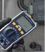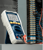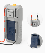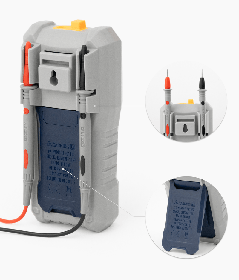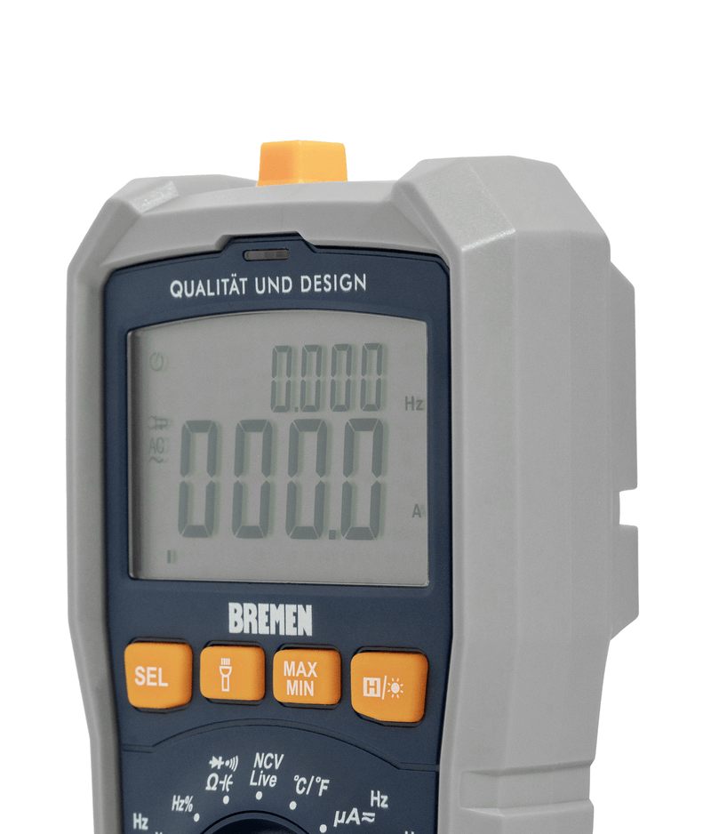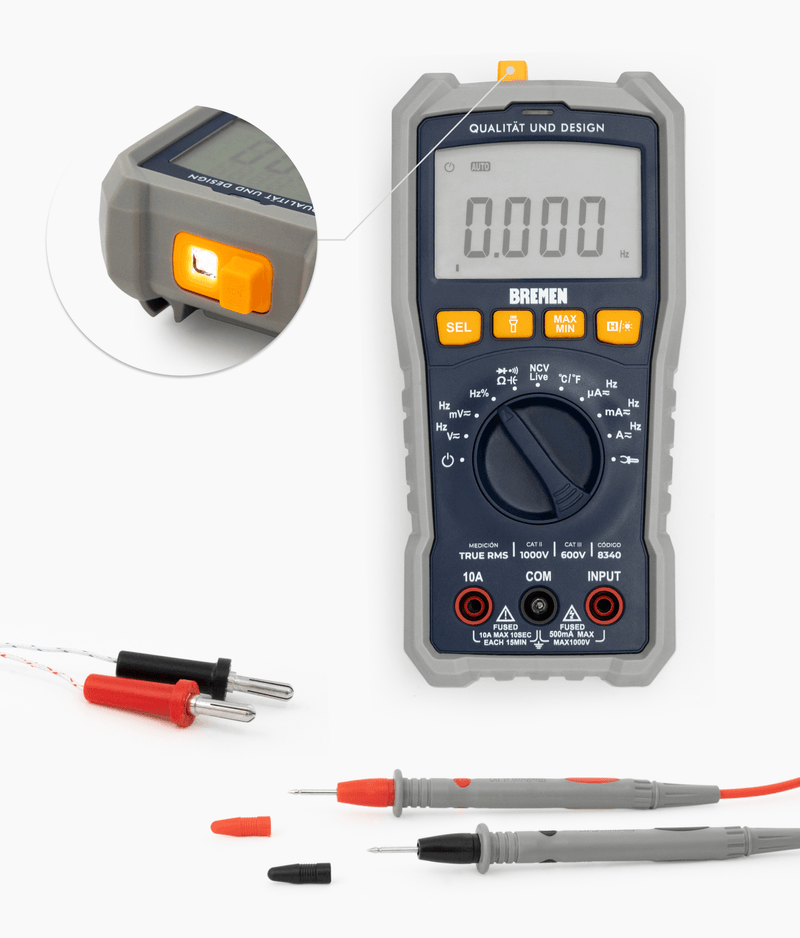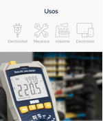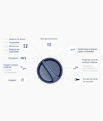 | Selección de función (Tensión alterna, Corriente continua, Corriente alterna, Resistencia, Capacitancia,Temperatura, Frecuencia, Ciclo de trabajo).