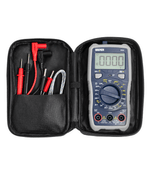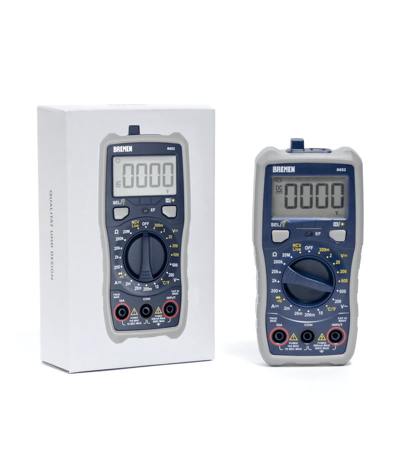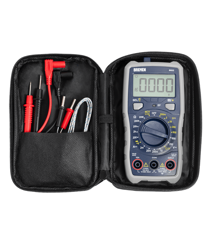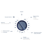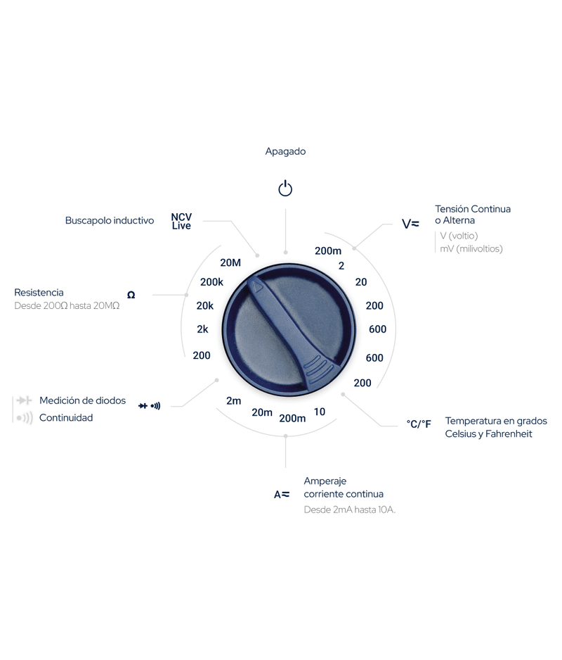| Selección de función (Tensión alterna, Tensión continua, Corriente continua, Resistencia, Temperatura).