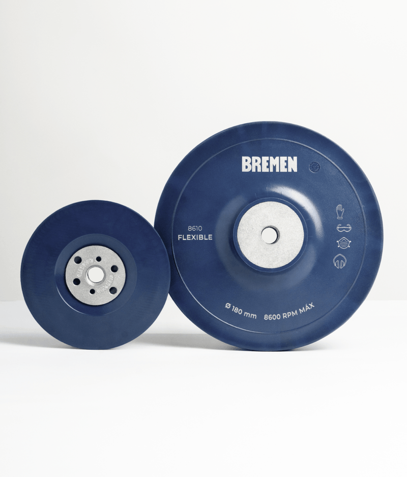 | Ideales para acabados y contornos en superficies curvas e irregulares. | Fabricados en TPE. | Compatibles con discos de 4 1/2"" (RPM Máx: 13.300) y 7" (RPM Máx: 8.600). | Para amoladora angular Ø 22mm.